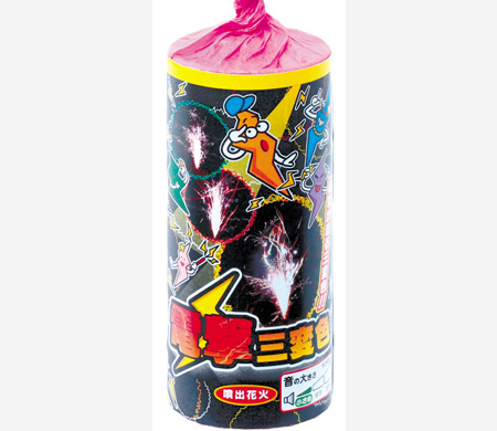 緑色火花、紅色火花が順に噴き出し、最後にバチバチ星が咲き散ります。かわいいイラストの三変化噴出花火です。
